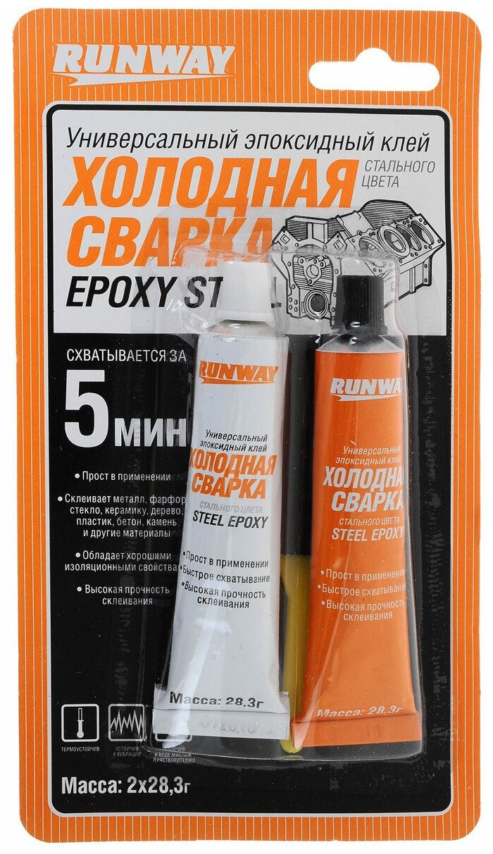 Универсальный эпоксидный клей Runway " Холодная сварка" предназначен для быстрого и надежного ремонта и склеивания материалов в любых сочетаниях: все виды металлов и их сплавы, фарфор, стекло, керамика, дерево, пластик, бетон, камень и другие материалы. Схватывается за 5 минут, отвердевает за 20 минут, конечная прочность склеивания достигается за час. Обладает хорошими изоляционными свойствами. Клей устойчив к воздействию химических растворителей, бензина, воды и ультрафиолетовым лучам. Не дает усадки и не деформируется. Обладает высокими прочностными характеристиками, выдерживает большие ударные и вибрационные нагрузки. После полного отверждения клея изделие можно подвергать дополнительной обработке: шлифовать, сверлить, обтачивать и красить.