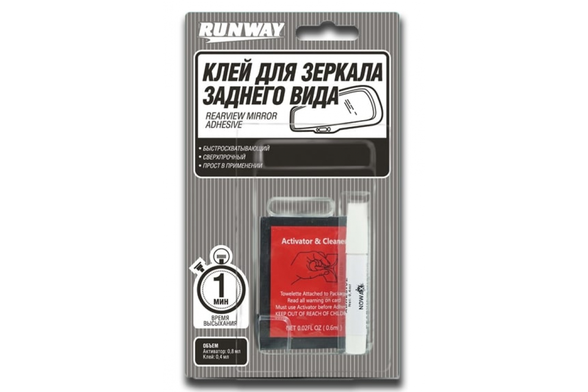 Высококачественный быстросхватывающийся клей Runway предназначен для прочной и долговременной фиксации зеркала заднего вида на лобовом стекле. Также подходит для склеивания металлов и стекла. Не подходит для склеивания деталей из пластика. Конечная прочность склеивания 30 мин. Диапазон рабочих температур от -50°С до 90°С.