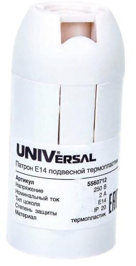 Патрон Е14 подвесной термопластик 2А 250В Universal 5560712 служит для фиксации лампы, используется для укомплектовывания светильников различных типов и назначения. Изделие выполнено из термопластика, белый цвет корпуса. Контактная группа изготовлена из высококачественных материалов