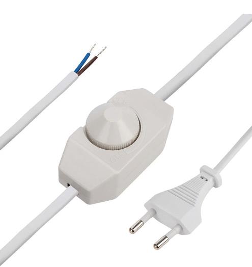 Сетевой шнур с диммером предназначен для подключения бытовых приборов, осветительной техники. Шнур состоит из провода ШВВП сечением 0,75 мм², укомплектованного литой неразборной плоской вилкой Евро, с подготовленными контактами, посередине провода расположен диммер в корпусе из ABC пластика.