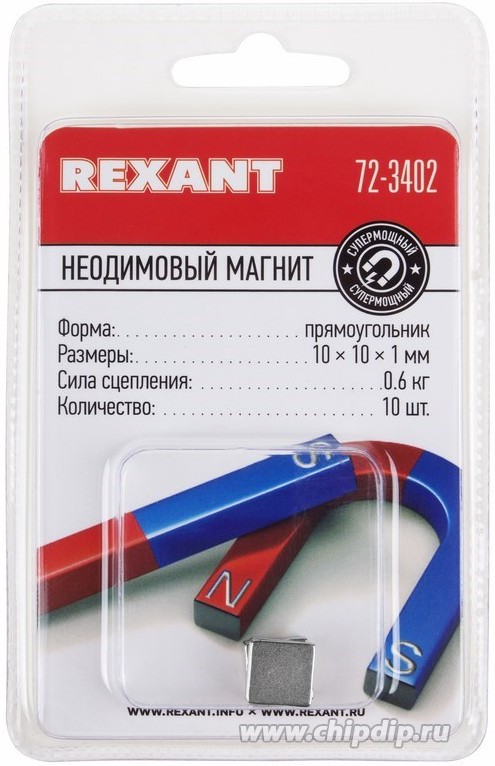 Постоянный редкоземельный неодимовый магнит Rexant состоит из сплава неодима, бора и железа. Известен своей мощностью притяжения и высокой стойкостью к размагничиванию. Применяется в различных областях промышленности, медицины, в быту и электронике.