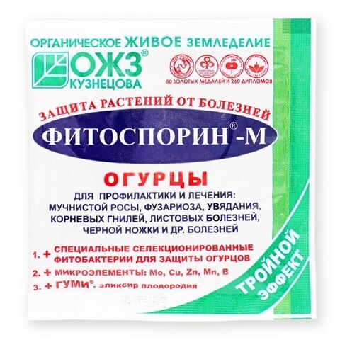 Биофунгицид, в основе которого – отселектированные, отобранные природные фитобактерии от болезней огурца и других бахчевых (арбуза, дыни, тыквы) в споровой форме, проникающие в ткани растений и вырабатывающие биологически активные вещества для их защиты и стимуляции. Защищает от обыкновенной мозаики, корневых и прикорневых гнилей, трахеомикоза, фузариоза, аскохитоза, бактериозов, мучнистой и ложномучнистой росы, альтернариоза, антракноза, кладоспориоза и др. болезней огурца и других культур семейства тыквенных.
