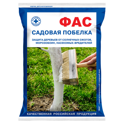 Побелка садовая ФАС состоит только из экологически чистых природных компонентов и применяется для защиты стволов деревьев, деревянных конструкций парников и теплиц, а также хозяйственных построёк1 хлевов, птичников и туалетов. В отличие от обычной садовой побелки, которая только защищает деревья от солнечных ожогов, побелка садовая ФАС еще и препятствует размножению насекомых-вредителей на деревьях и насекомых-паразитов в хозяйственных помещениях, защищает стволы и ветви деревьев от повреждений при резких колебаниях температуры в зимнее и ранней весеннее время (морозобоин).