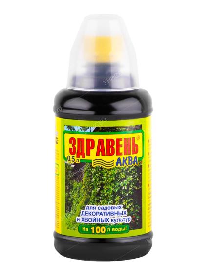 Здравень Аква для садовых декоративных и хвойных культур – жидкое комплексное органоминеральное удобрение с микроэлементами в хелатной форме. Применяется в качестве корневой и внекорневой подкормки для садовых декоративных и хвойных культур в личных подсобных хозяйствах. Препарат не содержит хлора, гарантирует правильное, гармоничное развитие растений, повышает качество, насыщенность, густоту окраски хвои и укрепляет корневую систему.