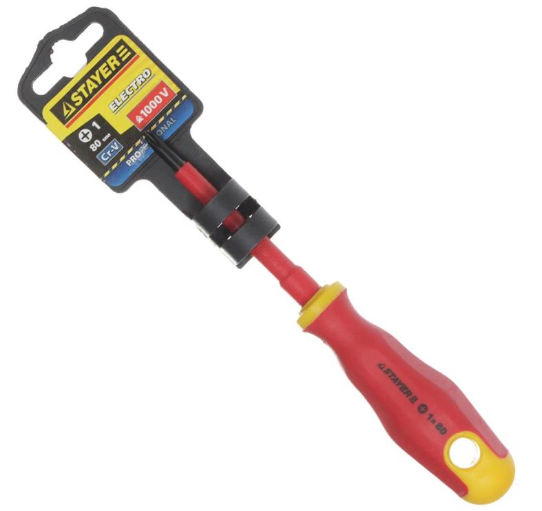 Диэлектрическая отвертка STAYER до 1000 В, PH1 х 80 мм 25142-1-08 используется с целью завинчивания и развинчивания крепежа около источников электронапряжения. Рабочая часть выполнена из долговечной хромованадиевой стали и имеет изоляционное покрытие для безопасной работы. За счет намагниченного наконечника инструментом легко и удобно пользоваться. Рукоятка отвертки не скользит в руке и обеспечивает надежный захват.