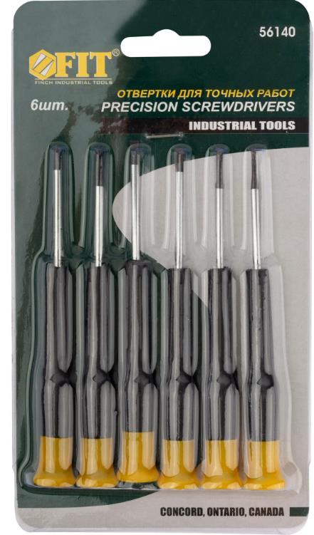 Набор отверток FIT 56140 предназначен для точных работ. Он состоит из шести инструментов одинаковой длины, но разного диаметра. Половина отверток в FIT 56140 крестовых, остальные плоские. Для удобства работы с мелкими крепежными элементами наконечники намагничены, это позволяет скорректировать положение винта или поднять его. Стержни отверток изготовлены из хромированной инструментальной стали высокого качества, а рукоятки – из обычного пластика.