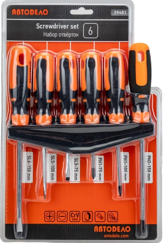 Набор Автодело состоит из 6 отверток с круглым стержнем. Отвертки применяются для монтажа и демонтажа различных узлов и агрегатов, где используется крепёж в виде винтов, шурупов, саморезов и т.п. с рабочим профилем крест или шлиц. Стержни круглые закалённые с намагниченными рабочими частями. Материал стержней - хром-ванадиевая сталь. Покрытие - хром. Двухкомпонентные эргономичные комбинированные рукоятки из ударопрочного пластика с резиновыми вставками.