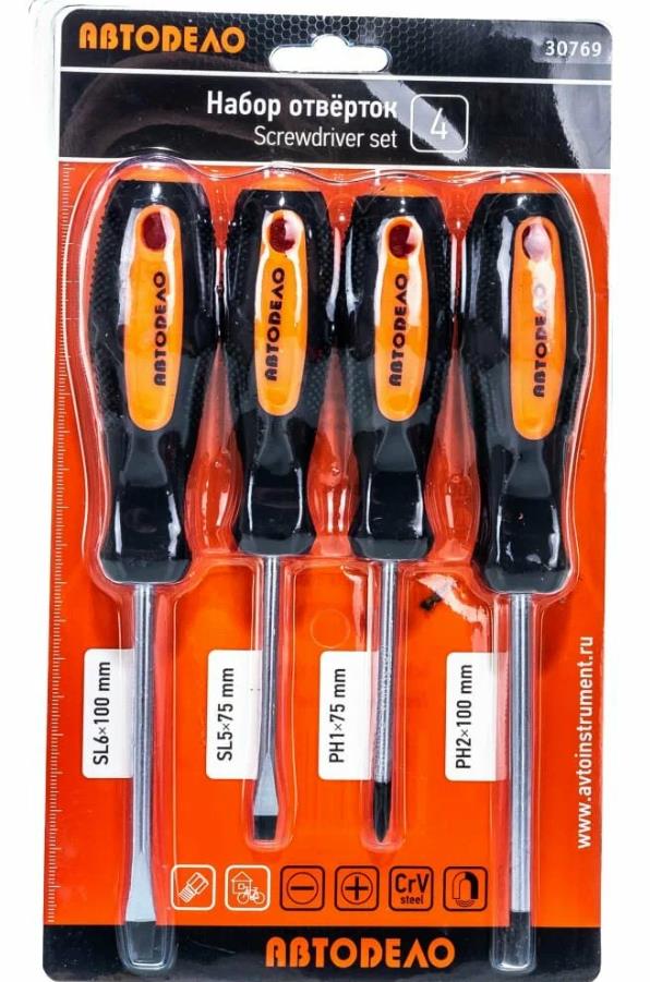 Набор отверток АвтоDело 4 предмета 30769 оптимален для ремонта транспортных средств и хозяйственных работ. Изделия подходят как для бытового применения, так и для использования в профессиональной мастерской. 4 модели разного размера, намагниченные наконечники, стержни из высококачественной стали, устойчивой к механическому воздействию, рабочая поверхность с хромоникелевым покрытием, исключающим коррозию,прорезиненные ручки эргономичной формы с рельефной поверхностью. Набор отверток позволяет качественно зафиксировать или извлечь винты, саморезы и другие крепежи.