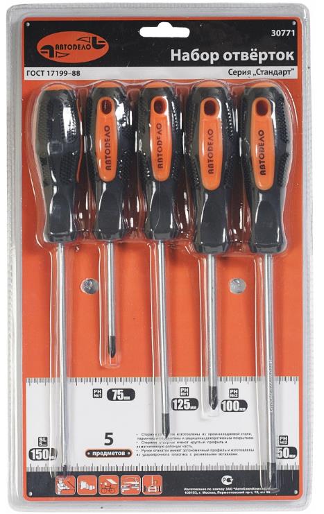 Набор отверток АвтоDело 5 предметов 30771 оптимален для ремонта транспортных средств и хозяйственных работ. Изделия подходят как для бытового применения, так и для использования в профессиональной мастерской.Пять моделей разного размера, намагниченные наконечники, стержни из высококачественной стали, устойчивой к механическому воздействию, рабочая поверхность с хромоникелевым покрытием, исключающим коррозию,прорезиненные ручки эргономичной формы с рельефной поверхностью. Набор отверток позволяет качественно зафиксировать или извлечь винты, саморезы и другие крепежи.