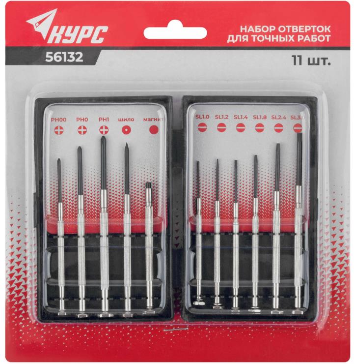 Отвертки курс 56132 часовые представляют собой набор из 11 инструментов, предназначенных для точных работ. Набор включает в себя все необходимые инструменты для выполнения различных задач. В комплекте вы найдете шило, а также отвертки с прямым и крестообразным наконечниками. Отвертки изготовлены из высоколегированной инструментальной стали, что обеспечивает их прочность и долговечность. Рукоятки выполнены из металла, что гарантирует надежный хват и удобство использования. Все инструменты упакованы в удобный блистер, который обеспечивает их сохранность и защиту от повреждений.