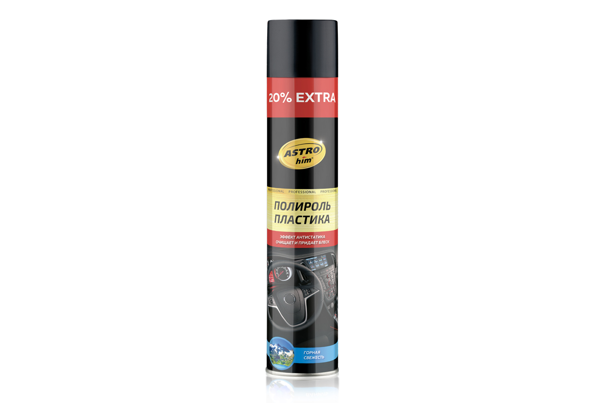 Полироль пластика ASTROhim - эффективное средство для ухода за пластиковыми, виниловыми и резиновыми элементами отделки интерьера автомобиля. Значительно улучшает внешний вид пластика, обновляет его цвет. Антистатические компоненты, содержащиеся в его составе, предотвращают чрезмерное оседание пыли на поверхность. Благодаря беспенному составу, полироль быстро и легко располировывается по поверхности. После обработки оставляет на поверхности тонкую не жирную и не липкую полимерную пленку, которая защищает пластик от выгорания и растрескивания. Кроме того, наполняет салон приятным ароматом. Полироль не содержит спирт, поэтому безопасен для всех видов пластика.