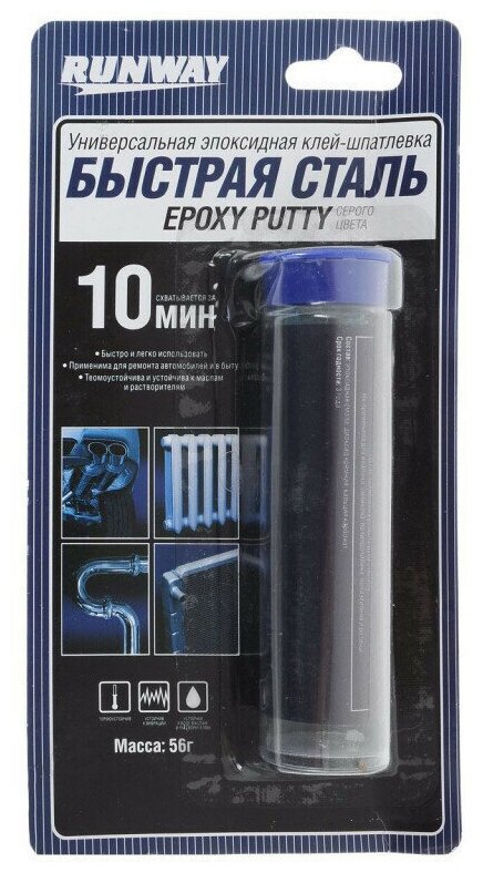 Холодная сварка Runway «Быстрая сталь» надежно и быстро склеивает различные материалы – металл, фарфор, стекло, керамику, дерево, пластик. Применяется для ремонта и восстановления большого числа изделий: радиатора, глушителя, аккумулятора, картера, корпусных и кузовных деталей. Также может применяться в быту для ремонта: мебели, сантехники, труб горячей и холодной воды, инструментов, аквариумов, зеркал и многого другого. Возможен ремонт под водой. Runway «Быструю сталь» легко использовать для изготовления отломанных или потерянных деталей методом лепки. Обладает хорошими изоляционными свойствами. Устойчива к воздействию химических растворителей, бензина, воды и ультрафиолетовым лучам, выдерживает высокую температуру до 260С. Схватывается за 10 минут, отвердевает за 20 минут, конечная прочность склеивания достигается за час. После отвердевания шпатлевки поверхности можно сверлить, нарезать в них резьбу, обтачивать, шкурить, красить.