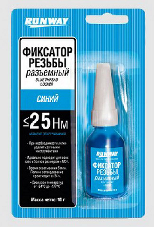 Фиксатор резьбовых соединений съемный синий от бренда Runway – универсальный состав средней прочности для фиксации резьбовых соединений. Герметизирует и создает соединения, устойчивые практически к любым протечкам, ударам и вибрациям. Идеально подходит для всех гаек и болтов.Защищает соединения от влаги и коррозии. Препятствует самоткручиванию деталей. При необходимости легко удалить ручными инструментами, Время схватывания 6 минут. Полное затвердевание происходит за 24 часа. Используется для болтов в крышках клапанов, водяных насосов и масляных поддонов, болтов ведущих валов, гаек регулировки качающихся рычагов, штифтов карбюратора и винтов крышек мостов и т. п. местах, где возможно самооткручивание резьбового соединения под воздействием вибрации и ударных нагрузок.
