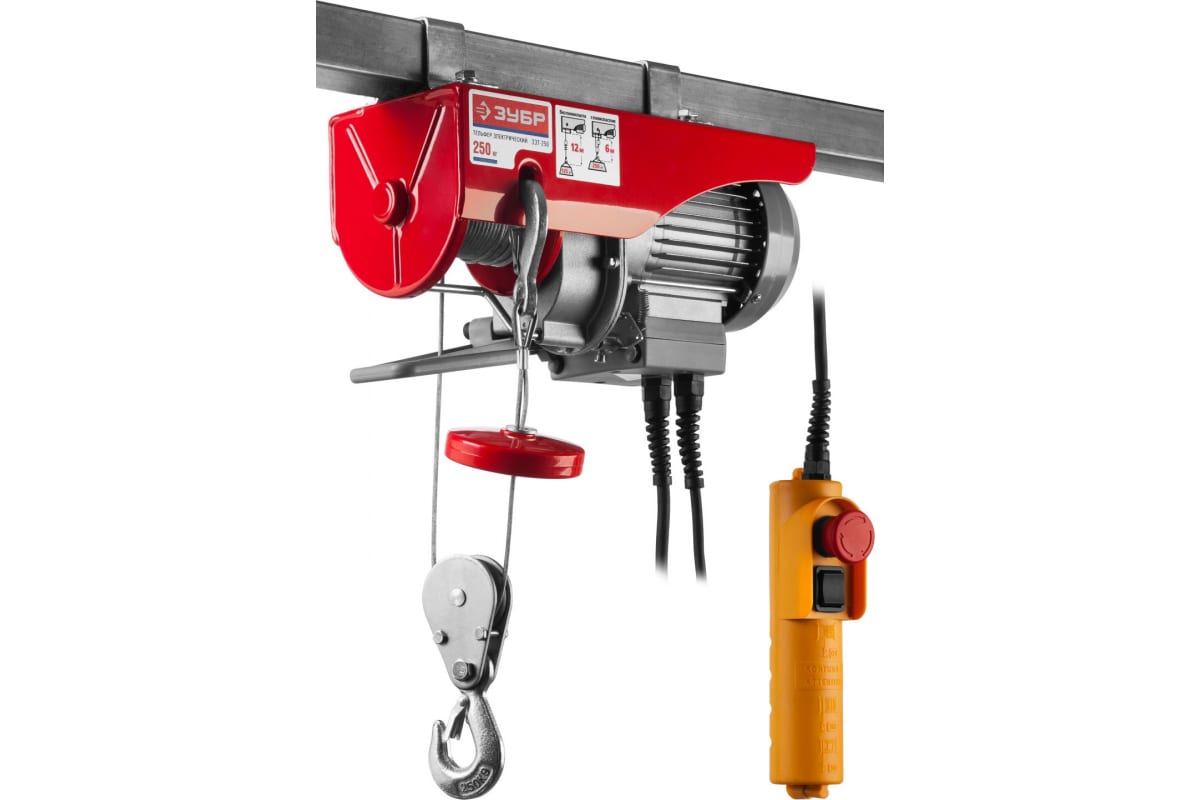 Электротельфер "Зубр" ЗЭТ-250 предназначен для подъема груза весом до 125 кг без полиспаста и до 250 кг с полиспастом. Тельфер имеет асинхронный электродвигатель, который не требует обслуживания в процессе работы. В случае неисправности можно быстро прервать работу агрегата, нажав кнопку экстренной остановки.