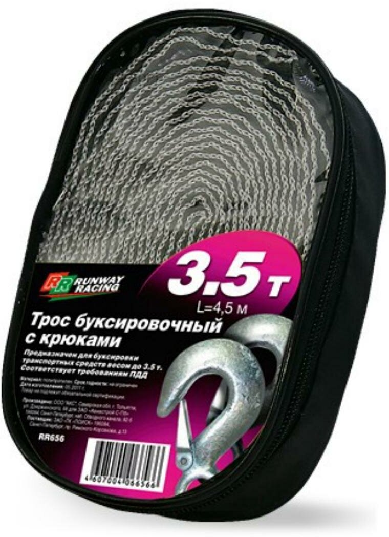 Трос буксировочный Runway с крюками в сумке RR656. Предназначен для буксировки транспортных средств весом до 3.5 тонн. Соответствует ПДД. Длина 4 метра.