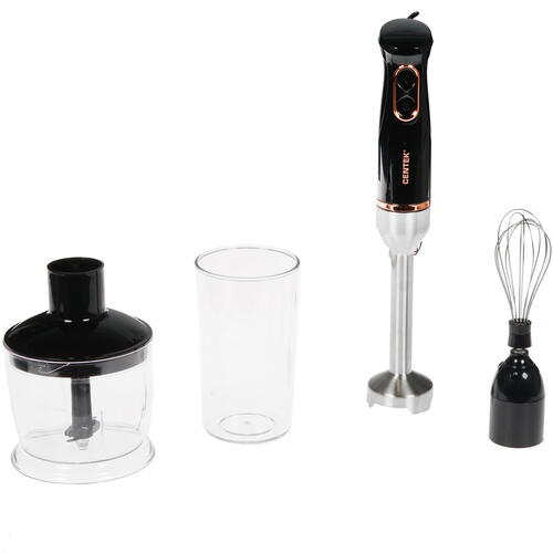 Блендер Centek действует на двух рабочих скоростях и обладает мощностью 800 Вт. Металлическая погружная часть обеспечивает длительный срок службы такого устройства. Блендер Centek укомплектован 600-миллилитровым измельчителем и 600-миллилитровым стаканом. В комплекте с устройством также есть венчик, поэтому вы быстро и с комфортом сможете готовить тесто.