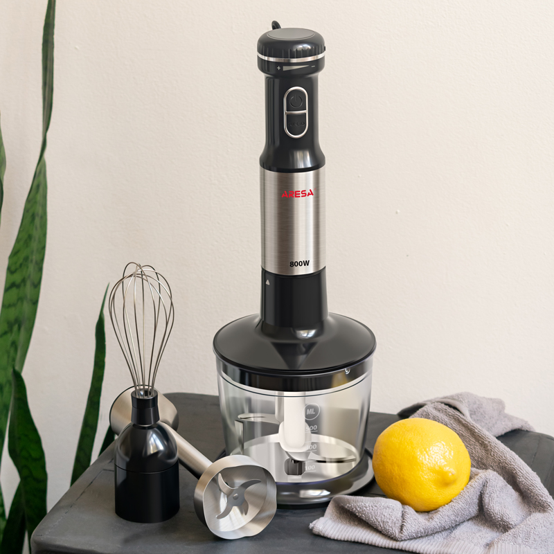 Блендер ARESA мощностью в 800 Вт станет вашим незаменимым кухонным помощником, ведь с его помощью вы сможете быстро и без значительных затрат энергии измельчить и перемешать ингредиенты, взбить крем для выпечки или мусс с помощью венчика. В общем, этот многофункциональный прибор придется вам по вкусу во всех смыслах. В комплектацию Aresa входят чаша для измельчения объемом 500 мл, мерный стакан 600 мл и венчик для взбивания.