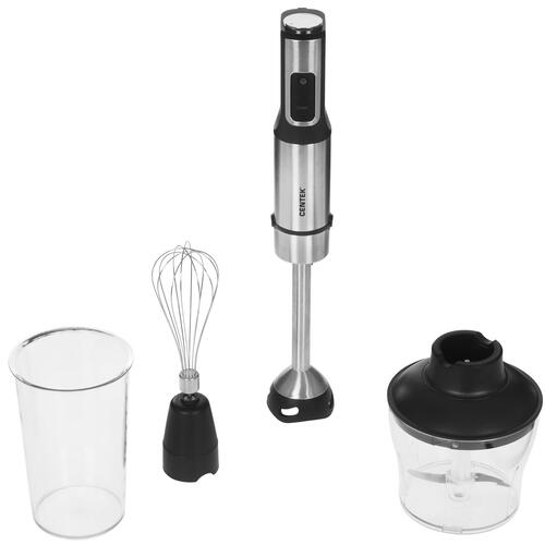 Блендер Centek CT-1330 поставляется в комплекте с погружной насадкой, венчиком для взбивания, измельчителем 650 мл и мерным стаканом емкостью 800 мл. На рукоятке расположены кнопки управления. Среди других характеристик блендера – сетевой кабель длиной 1 метр.