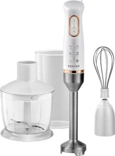 Блендер Centek CT-1347 действует на двух рабочих скоростях и обладает мощностью 800 Вт. Металлическая погружная часть обеспечивает длительный срок службы такого устройства. Блендер Centek CT-1347 укомплектован 600-миллилитровым измельчителем и 600-миллилитровым стаканом. В комплекте с устройством также есть венчик, поэтому вы быстро и с комфортом сможете готовить тесто.