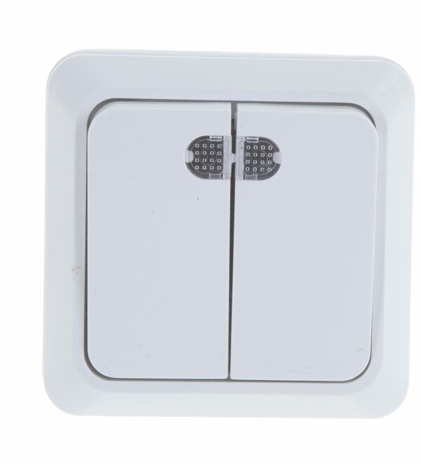 Двухклавишный выключатель с подсветкой, белый UNIVersal Олимп имеет классическую квадратную форму и белый цвет пластикового корпуса. Изделие легко устанавливается накладным способом. Служит для регулировки освещения многоламповых люстр или двух отдельных помещений, например, раздельного санузла или коридоров.