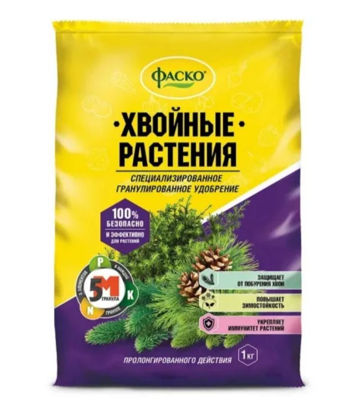Удобрение для хвойных растений Фаско гранулированное пролонгированного действия 1 кг. Применяется для ухода за хвойными растениями. Способствует укреплению иммунитета и повышению зимостойкости растений. Содержание в составе магния и кальция обеспечивают сохранность зеленого окраса хвои круглый год. Применяется для ухода за многолетними хвойными культурами: елями, соснами, пихтами, можжевельниками, туями и многими другими.