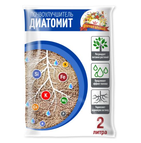 Царица цветов Диатомит 2л пористый осадочный минерал, который состоит из осколков скелетов окаменелых диатомовых водорослей. Диатомит используется для различных видов растений, включая: овощные, цветочные, плодовые культуры, также используют диатомит для комнатных растений и рассады.