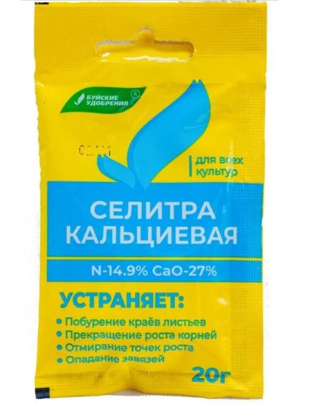 Водорастворимое комплексное азотно-кальциевое удобрение для подкормок овощных, плодовых, цветочных, декоративных и других культур. Очень важным свойством кальциевой селитры является то, что она считается лучшим удобрением для кислых почв. Кальциевая селитра оказывает оживляющее действие на растения, способствуя их качественной вегетации, так как поглощает из грунта избыток марганца и железа, металлов, которые содержаться в закисших почвах в больших количествах. Недостаток кальция, сказывается в первую очередь, на корневой системе.