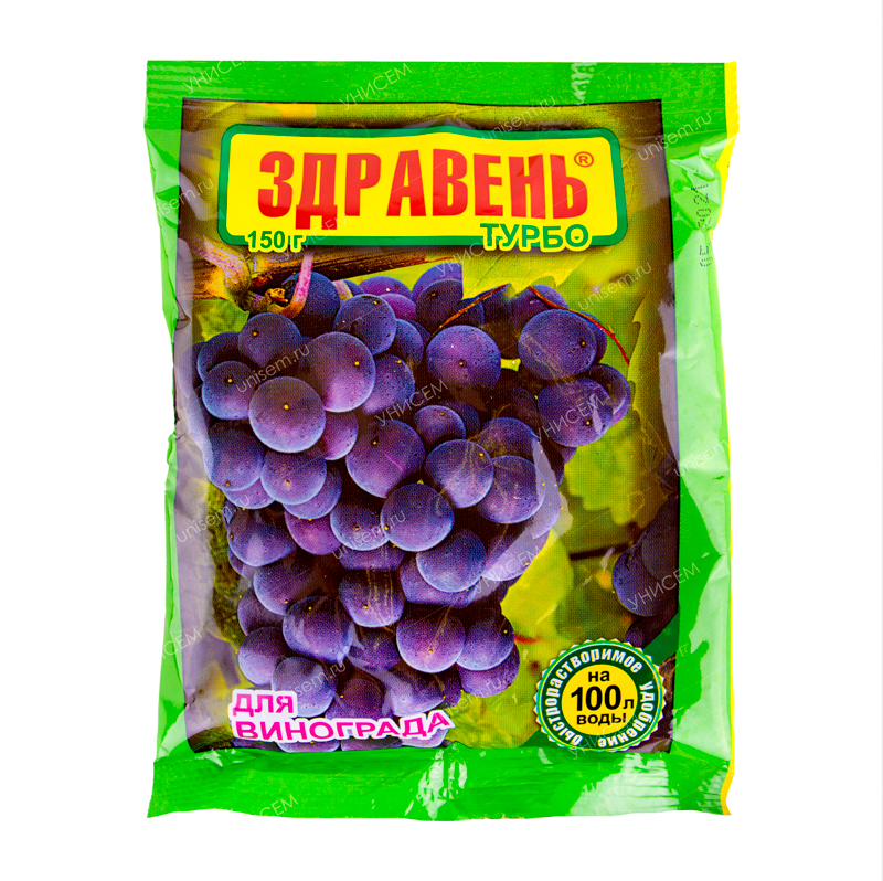 Здравень Турбо для винограда – быстрорастворимое концентрированное удобрение. Применяется для корневой и внекорневой подкормки всех сортов винограда. Препарат усиливает рост и развитие растений, значительно повышает урожайность, повышает содержание в ягодах сахаров, витаминов и других полезных веществ, помогает наращиванию мощной листовой массы и способствует активной закладке плодовых и зимующих глазков под урожай следующего года.