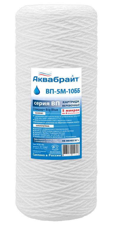 Картридж АКВАБРАЙТ ВП-5М-10ББ изготовлен из веревочного полипропилена с пищевым допуском. Предназначен для механической очистки воды от песка, грязи и ржавчины. Рекомендуется для предварительной очистки воды.