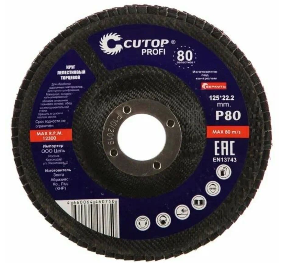Круг наждачный лепестковый Cutop 70-12580 используется для профессионального и повседневного использования. Абразивный материал - кальценированный оксид алюминия, 80 лепестков, угол наклона 10 градусов, 100% КПД, повышенная износостойкость.