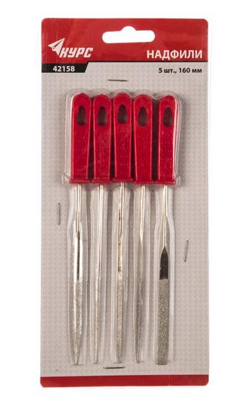 Алмазные узкие надфили КУРС 160 мм, 5 шт 42158 произведены из инструментальной стали, покрыты алмазным напылением, что говорит об их надежности и долговечности. Имеют удобные пластиковые ручки. В набор входят надфили: плоский, квадратный, трехгранный, круглый и полукруглый.