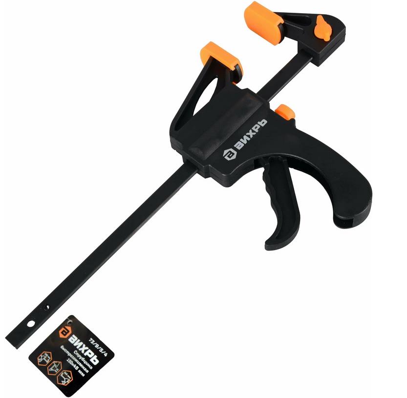 Струбцина быстрозажимная Вихрь 150х45 мм - инструмент пистолетной формы предусматривает наличие рычажного быстрозажимного механизма, это делает эксплуатацию струбцины легче, позволяя работать с ней одной рукой. Конструкция инструмента позволяет использовать его также в режиме распора. Удобная система снятия фиксации. Обрезиненные рукоятки для комфортной работы. Рифлёные эластичные губки защищают обрабатываемые поверхности от повреждений. 2 режима работы: зажим и распор. Особая конструкция курка защищает от излома. Высокопрочная стальная направляющая.