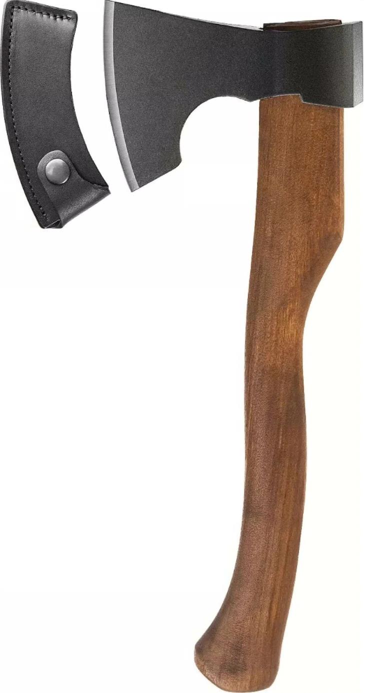 Кованый топор с деревянной рукояткой Россия Ижсталь-ТНП Викинг-Премиум 600 г 20725 предназначен для колки дров, рубки мелких деревьев и веток. Голова выкована из инструментальной стали и надежно закреплена на топорище. Рукоятка выполнена из высококачественной древесины, для долгого срока службы она обработана олифой. Для безопасного хранения и транспортировки предусмотрен кожаный чехол.