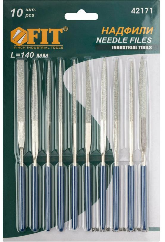 Алмазные надфили ПВХ ручка, 3х140х50 мм, 10 штук FIT 42171 применяются для тонкой обработки деталей из различных материалов дерева, пластика, металла и прочих. Изделие выполнено из инструментальной стали с ПВХ рукоятками. В комплекте имеются типовые надфили, в том числе и ножовочный, с напылением из технических алмазов. Набор упакован в блистер.