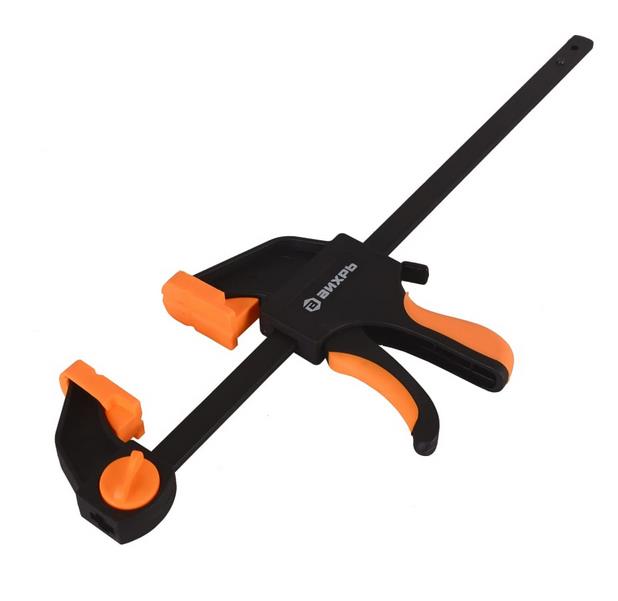Струбцина быстрозажимная Вихрь 300х60 мм - инструмент пистолетной формы предусматривает наличие рычажного быстрозажимного механизма, это делает эксплуатацию струбцины легче, позволяя работать с ней одной рукой. Конструкция инструмента позволяет использовать его также в режиме распора. Удобная система снятия фиксации. Обрезиненные рукоятки для комфортной работы. Рифлёные эластичные губки защищают обрабатываемые поверхности от повреждений. 2 режима работы: зажим и распор. Особая конструкция курка защищает от излома. Высокопрочная стальная направляющая.