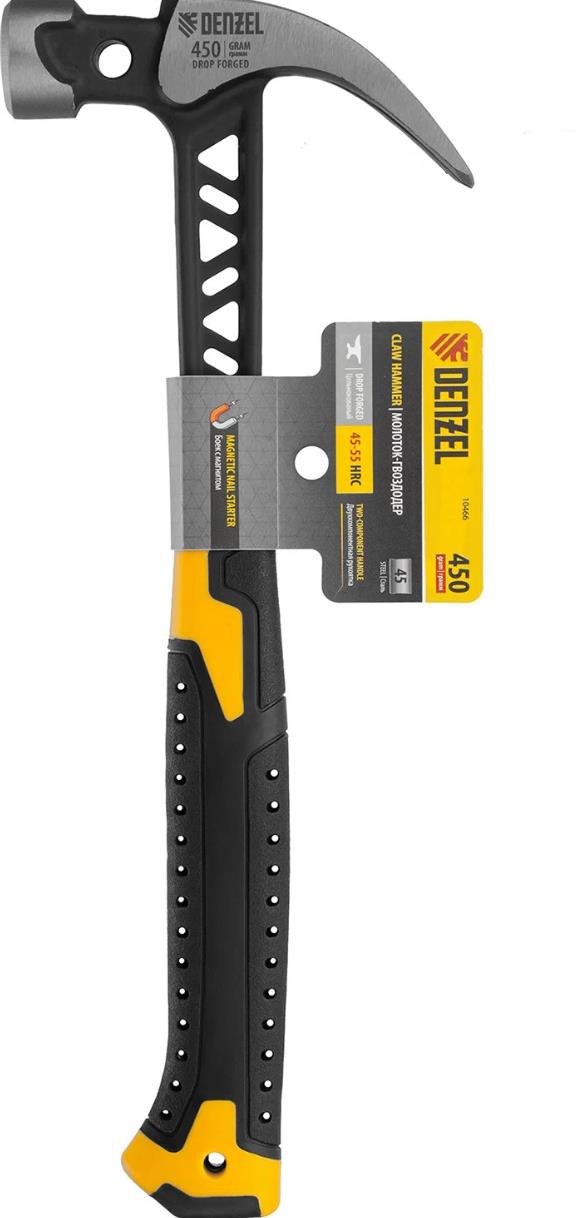 Цельнокованый молоток-гвоздодер с бойком весом 450 г, с магнитом и двухкомпонентной обрезиненной рукояткой, предназначен для забивания и извлечения гвоздей. Имеет рабочую часть специальной формы — с круглым бойком и плоским носком с клиновидной прорезью. Магнитный держатель в верхней части бойка позволяет установить гвоздь, не придерживая его рукой, что упрощает работу в труднодоступных местах. Молоток используется в профессиональной сфере, пригодится также и в быту.